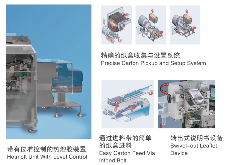 CM400高速智裝盒機(jī)是機(jī)電一體化的高科技產(chǎn)品,該機(jī)器的優(yōu)點(diǎn)在于:其陽臺(tái)是設(shè)計(jì)具有符合藥品生產(chǎn)質(zhì)量管理規(guī)范的基本及其結(jié)構(gòu),并且其包裝部分與傳動(dòng)部分完全分個(gè)開來。主傳動(dòng)部分可改為伺服傳動(dòng)系統(tǒng),運(yùn)行更平穩(wěn),有效降低噪音,參數(shù)調(diào)節(jié)更健康。最高速度可達(dá)400盒/分鐘,適用于泡罩板、瓶子、安瓿瓶、軟膏等形狀的產(chǎn)品裝盒。CM400高速智裝盒機(jī)是機(jī)電一體化的高科技產(chǎn)品,該機(jī)器的優(yōu)點(diǎn)在于:其陽臺(tái)是設(shè)計(jì)具有符合藥品生產(chǎn)質(zhì)量管理規(guī)范的基本及其結(jié)構(gòu),并且其包裝部分與傳動(dòng)部分完全分個(gè)開來。主傳動(dòng)部分可改為伺服傳動(dòng)系統(tǒng),運(yùn)行更平穩(wěn),有效降低噪音,參數(shù)調(diào)節(jié)更健康。最高速度可達(dá)400盒/分鐘,適用于泡罩板、瓶子、安瓿瓶、軟膏等形狀的產(chǎn)品裝盒。CM400高速智裝盒機(jī)是機(jī)電一體化的高科技產(chǎn)品,該機(jī)器的優(yōu)點(diǎn)在于:其陽臺(tái)是設(shè)計(jì)具有符合藥品生產(chǎn)質(zhì)量管理規(guī)范的基本及其結(jié)構(gòu),并且其包裝部分與傳動(dòng)部分完全分個(gè)開來。主傳動(dòng)部分可改為伺服傳動(dòng)系統(tǒng),運(yùn)行更平穩(wěn),有效降低噪音,參數(shù)調(diào)節(jié)更健康。最高速度可達(dá)400盒/分鐘,適用于泡罩板、瓶子、安瓿瓶、軟膏等形狀的產(chǎn)品裝盒。CM400高速智裝盒機(jī)是機(jī)電一體化的高科技產(chǎn)品,該機(jī)器的優(yōu)點(diǎn)在于:其陽臺(tái)是設(shè)計(jì)具有符合藥品生產(chǎn)質(zhì)量管理規(guī)范的基本及其結(jié)構(gòu),并且其包裝部分與傳動(dòng)部分完全分個(gè)開來。主傳動(dòng)部分可改為伺服傳動(dòng)系統(tǒng),運(yùn)行更平穩(wěn),有效降低噪音,參數(shù)調(diào)節(jié)更健康。最高速度可達(dá)400盒/分鐘,適用于泡罩板、瓶子、安瓿瓶、軟膏等形狀的產(chǎn)品裝盒。